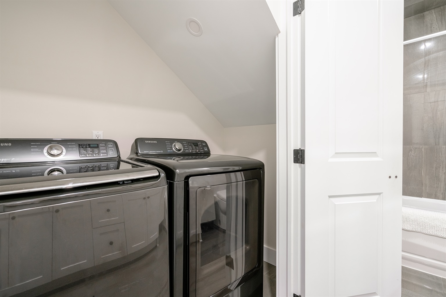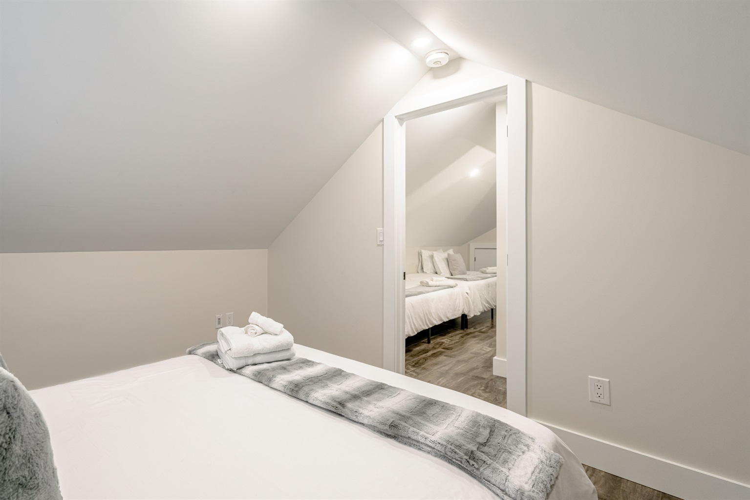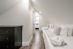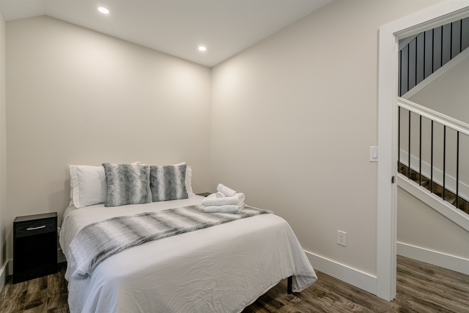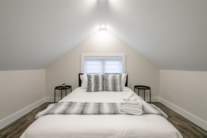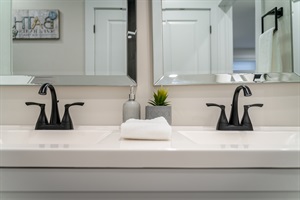 The house comfortably sleeps up to six guests featuring 2 queen beds and 2 twin beds. With one queen bedroom on the main floor and one on the 2nd floor with an open loft space with two twin beds, each bedroom offers a serene, peaceful environment, featuring plush bedding and plenty of storage. Wake up feeling refreshed and ready to take on the day’s adventures. The bathroom on the main floor features high-end finishes and is stocked with luxury toiletries, providing both functionality and elegance. Additionally, a convenient half-bath on the upper level makes for a comfortable stay.