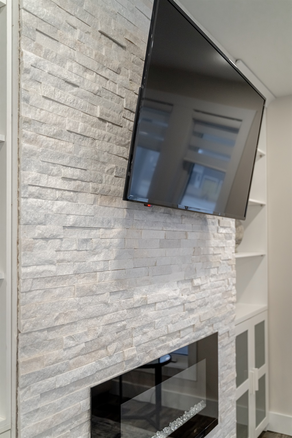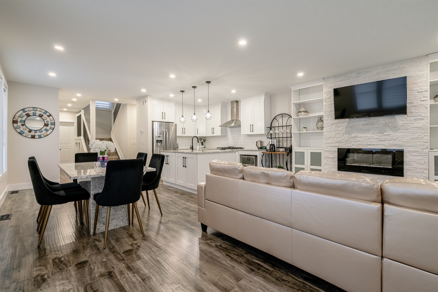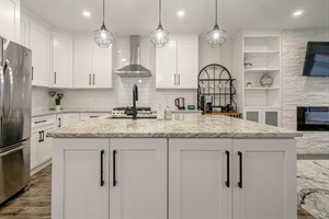 As you step inside, you’re greeted by a spacious, airy, open-concept layout that creates the perfect atmosphere for both relaxation and entertaining. The living area features comfortable couches and a Smart TV, so you can cuddle up by the fireplace on cool evenings, streaming your favorite shows. Large windows allow natural light to pour into the space, enhancing the warm, cozy ambiance. Whether you’re spending time with family or friends, this home offers the ideal setting to create lasting memories.