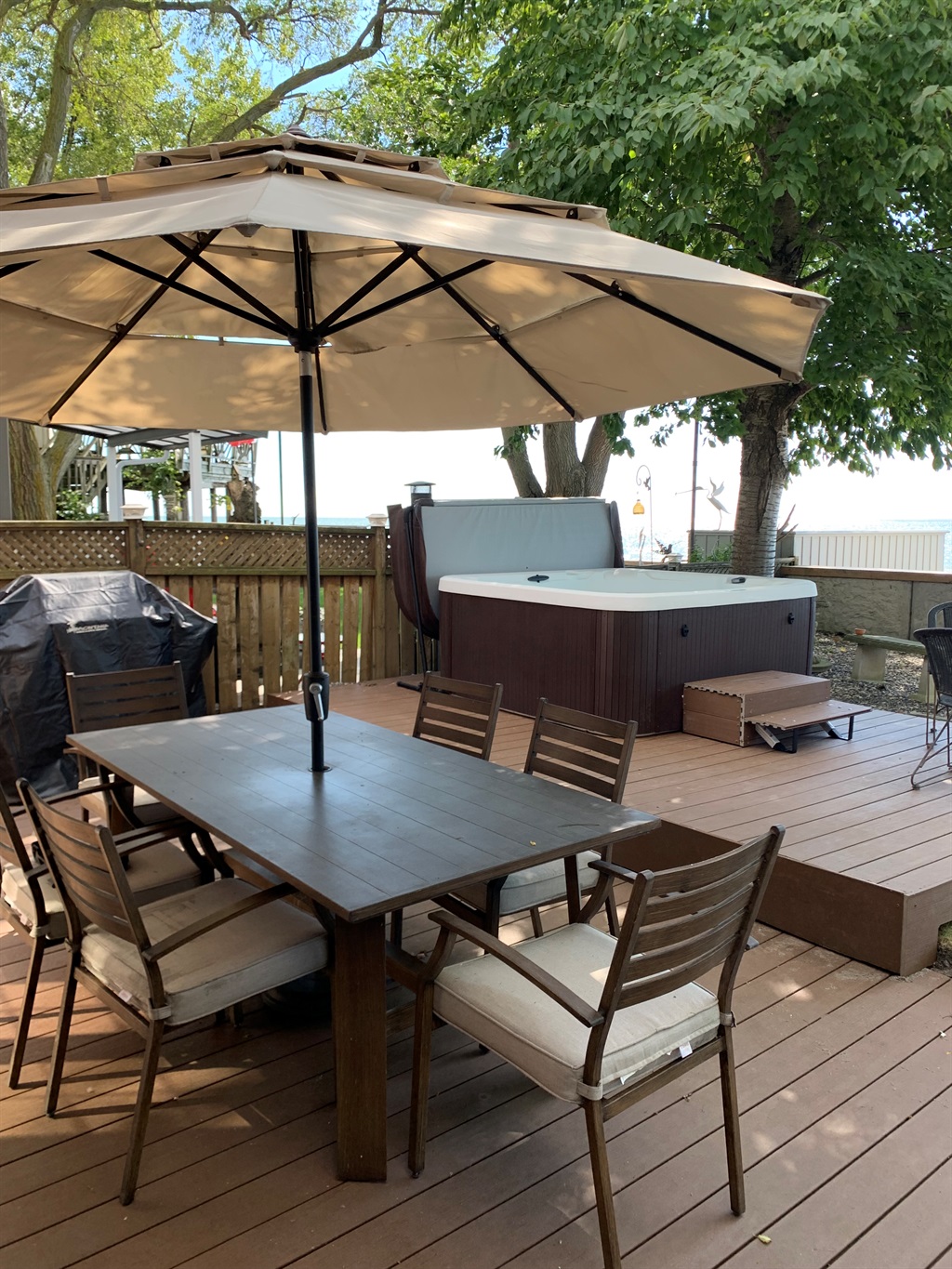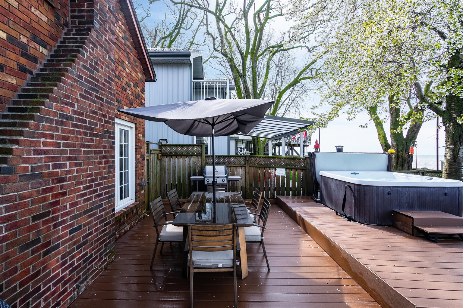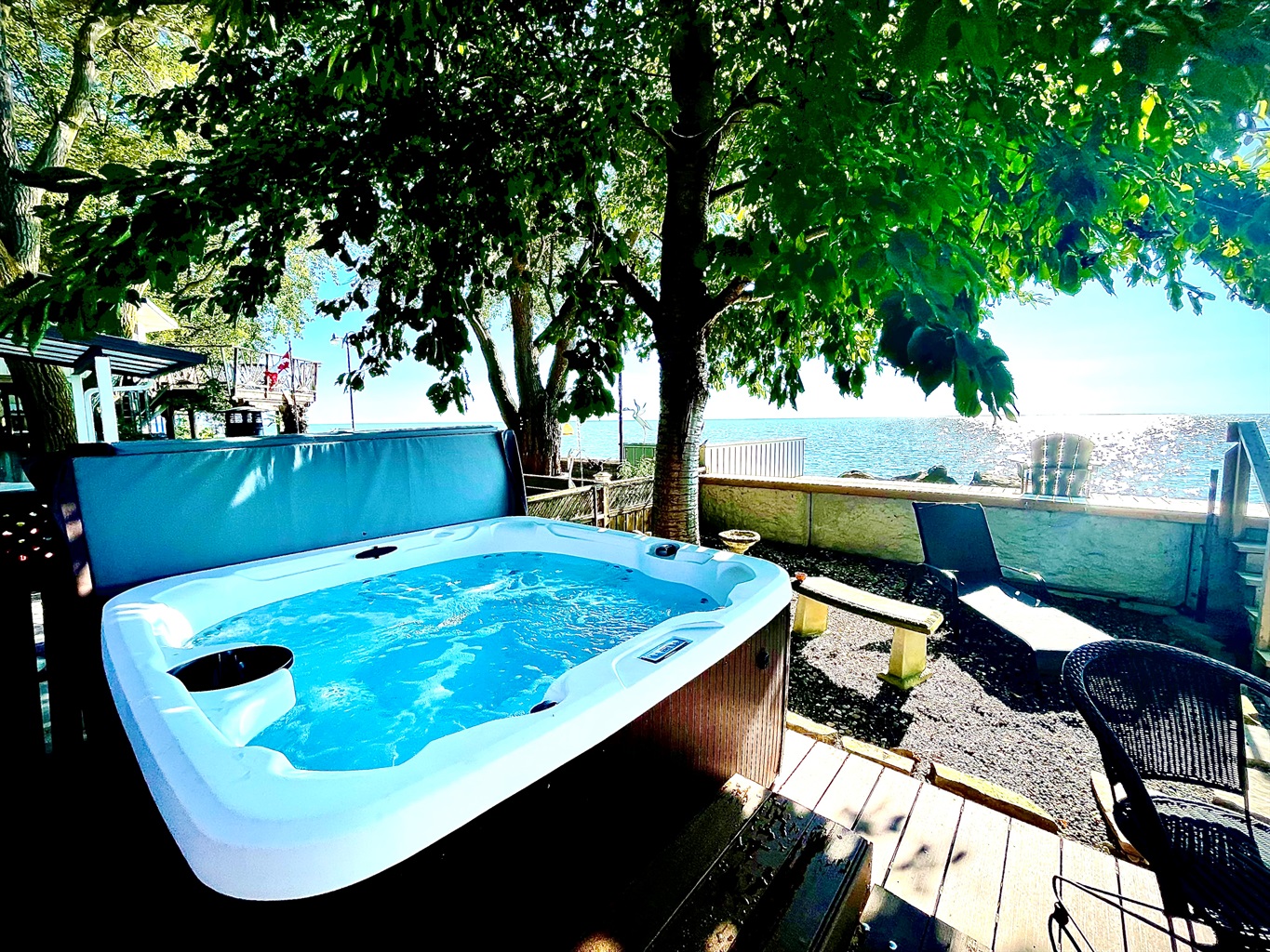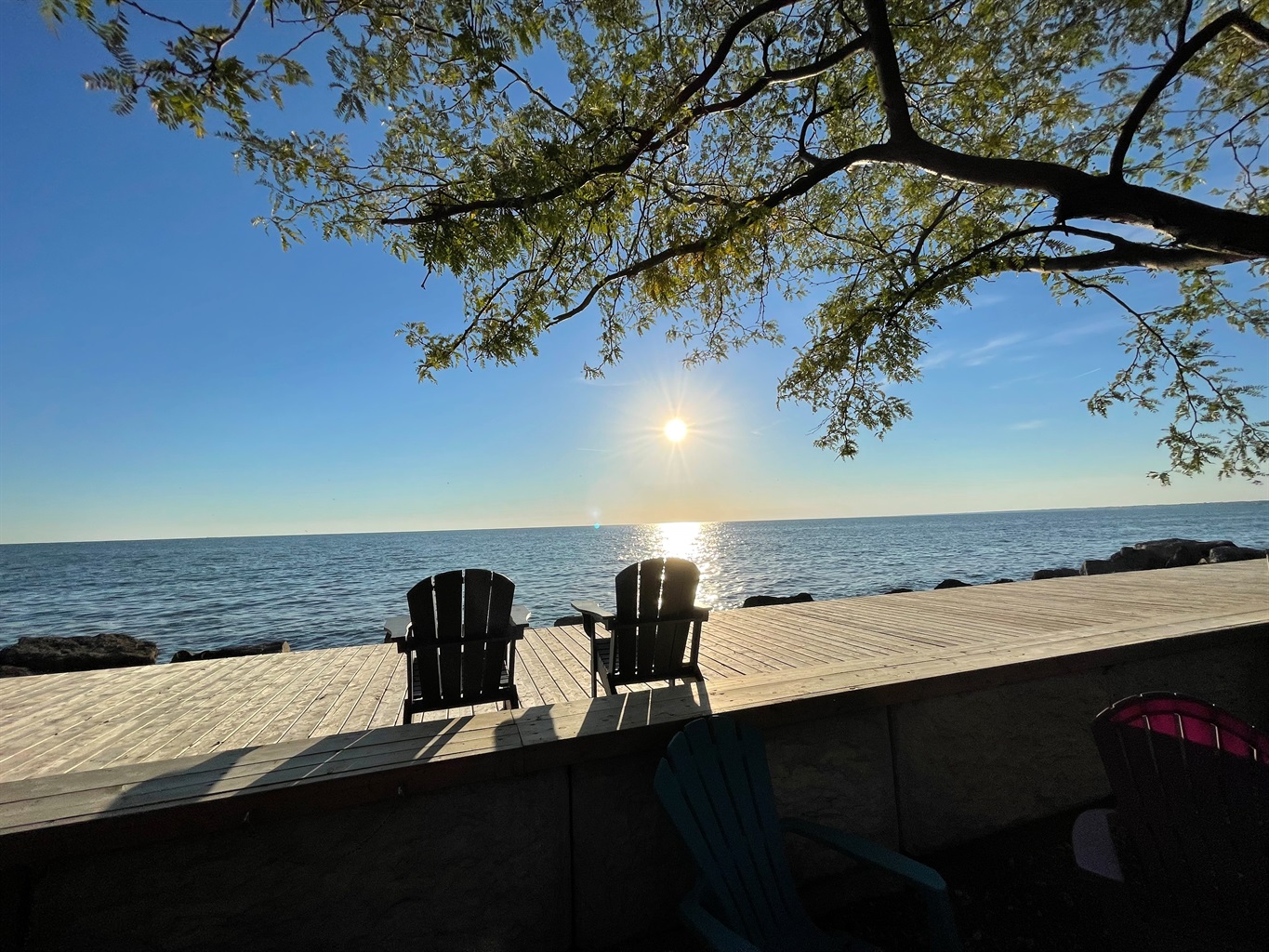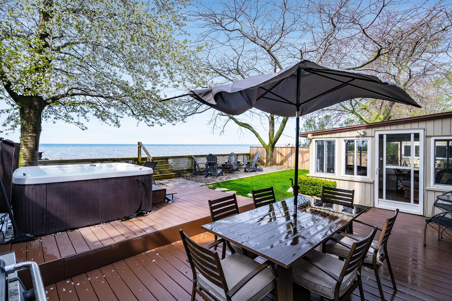 From the dining room, step into the sunroom, which opens up to a beautiful backyard overlooking Lake Erie. This outdoor space is designed for relaxation and gatherings. Whether you're dining al fresco at the outdoor table, grilling on the natural gas BBQ, or stargazing around the fire pit, you'll be surrounded by stunning lake views and tranquility. The hot tub offers another layer of relaxation, especially as you watch the sunset across the water.