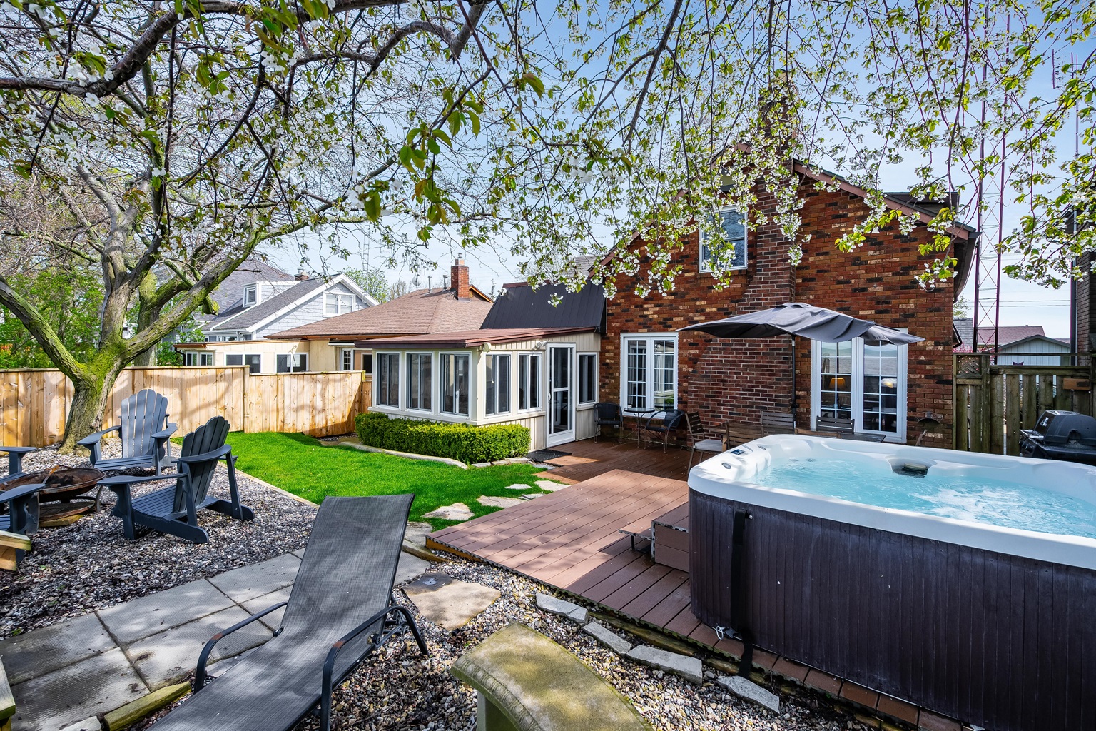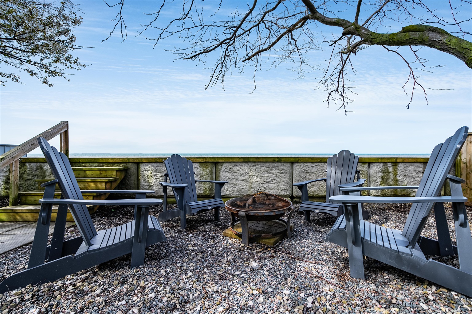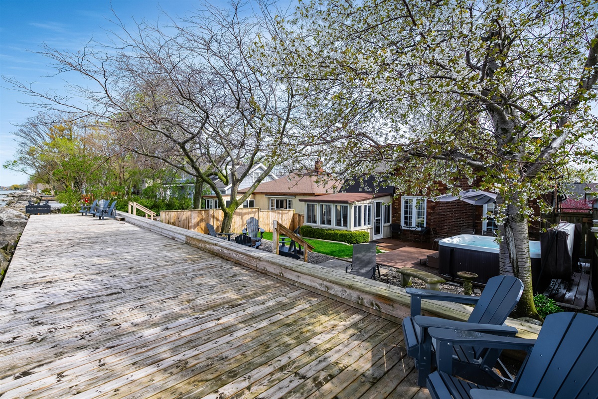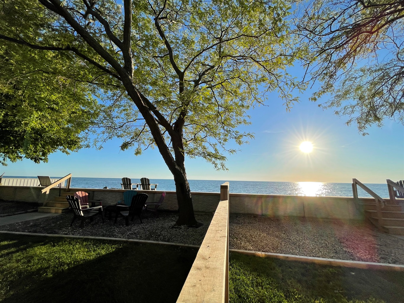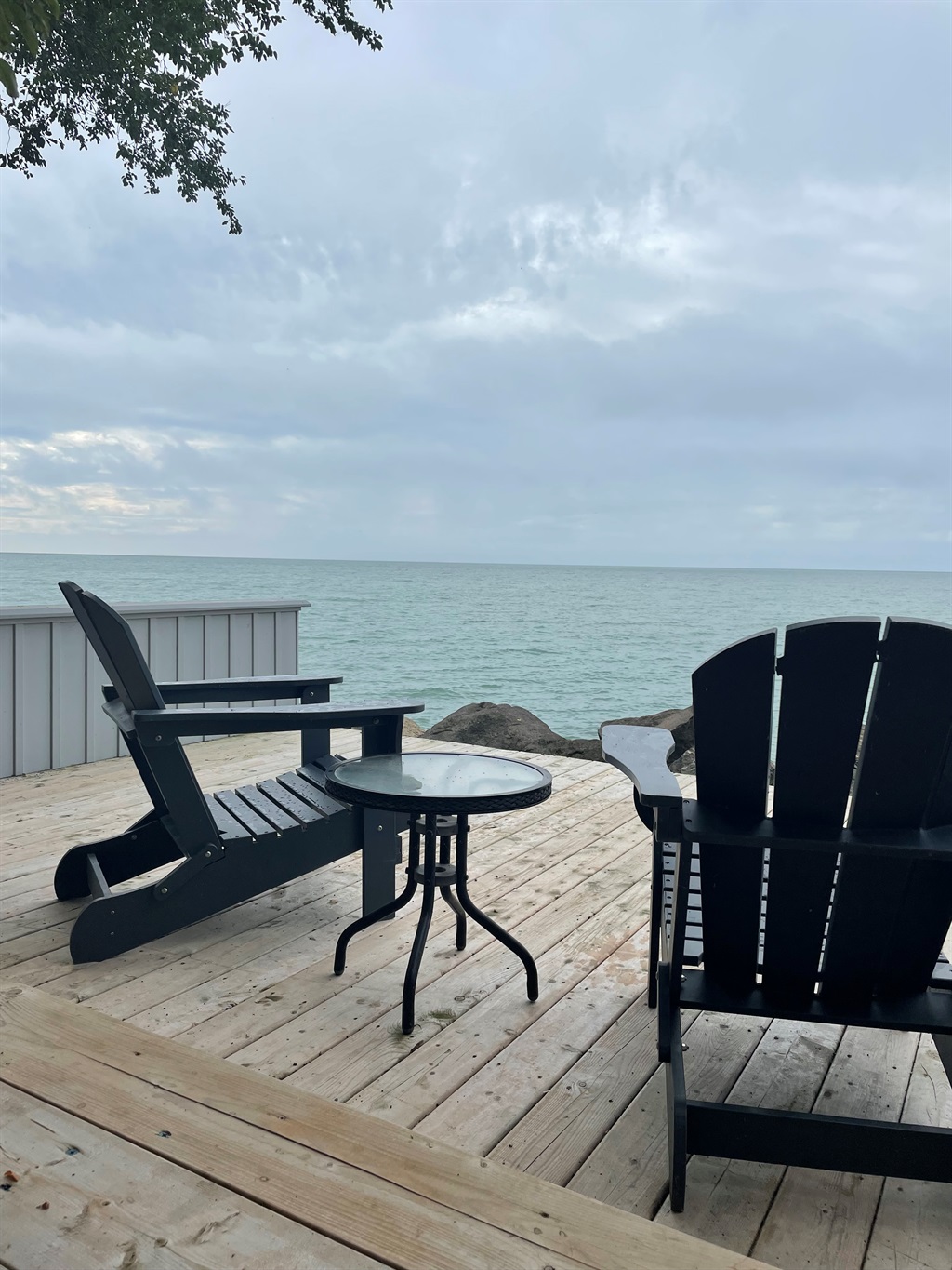From the dining room, step into the sunroom, which opens up to a beautiful backyard overlooking Lake Erie. This outdoor space is designed for relaxation and gatherings. Whether you're dining al fresco at the outdoor table, grilling on the natural gas BBQ, or stargazing around the fire pit, you'll be surrounded by stunning lake views and tranquility. The hot tub offers another layer of relaxation, especially as you watch the sunset across the water.