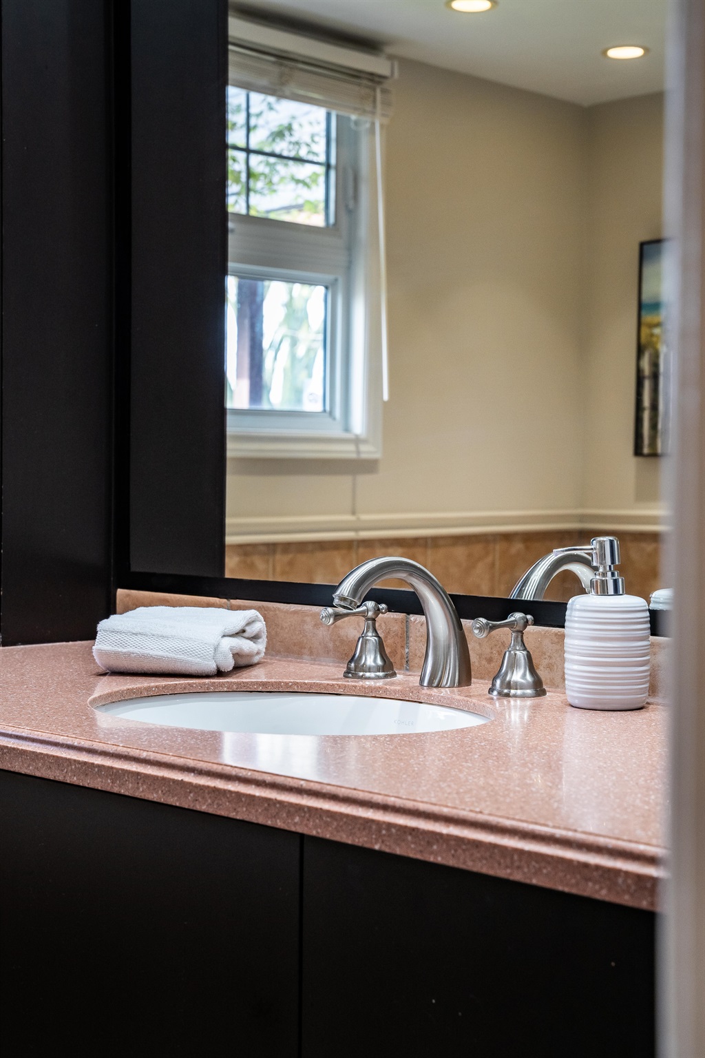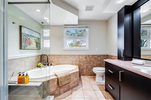 As you arrive, you'll find convenient parking for three vehicles right in front of the cottage. Step inside to an inviting open-concept space where the fully equipped kitchen flows effortlessly into the dining and living areas, making it easy to cook and gather together. The main floor offers a comfortable bedroom with a queen-size bed and high-quality linens, as well as a full bathroom featuring a jetted tub and walk-in rain shower—perfect for unwinding after a day of exploring the nearby parks or beaches.