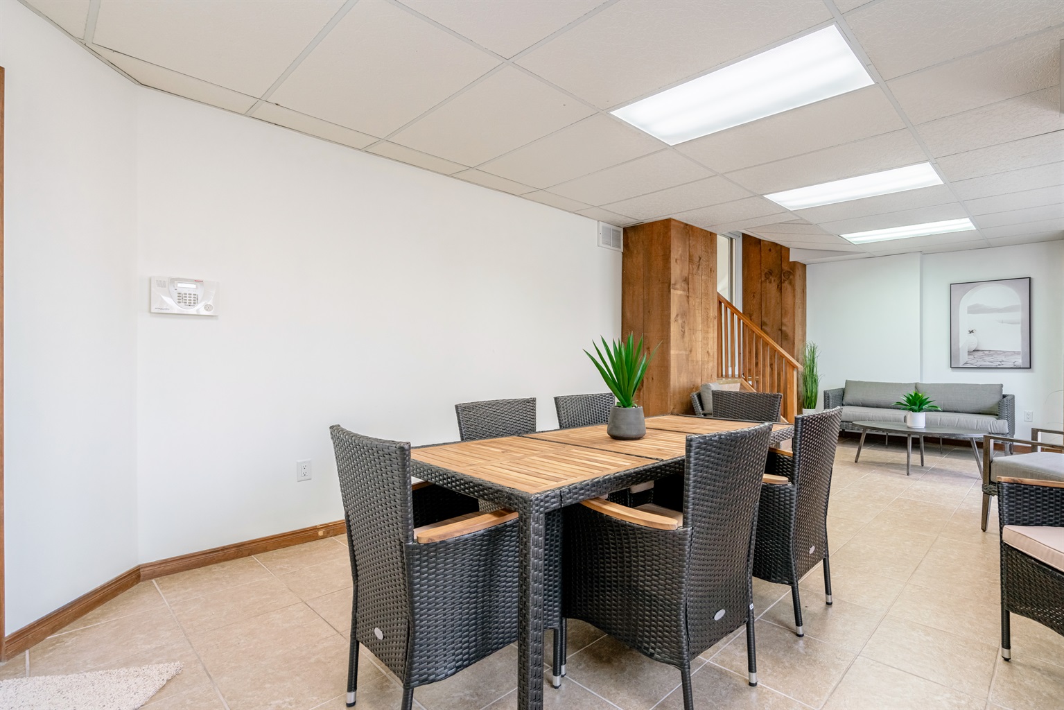 The main living area of the home features an open-concept design, a spacious dining area, and a comfortable living room with a cozy gas fireplace. The kitchen is equipped with high-end appliances, including a gas stove, and a large fridge/freezer. The dining area features a large table with seating for eight guests, making it the perfect spot for family dinners or entertaining friends.